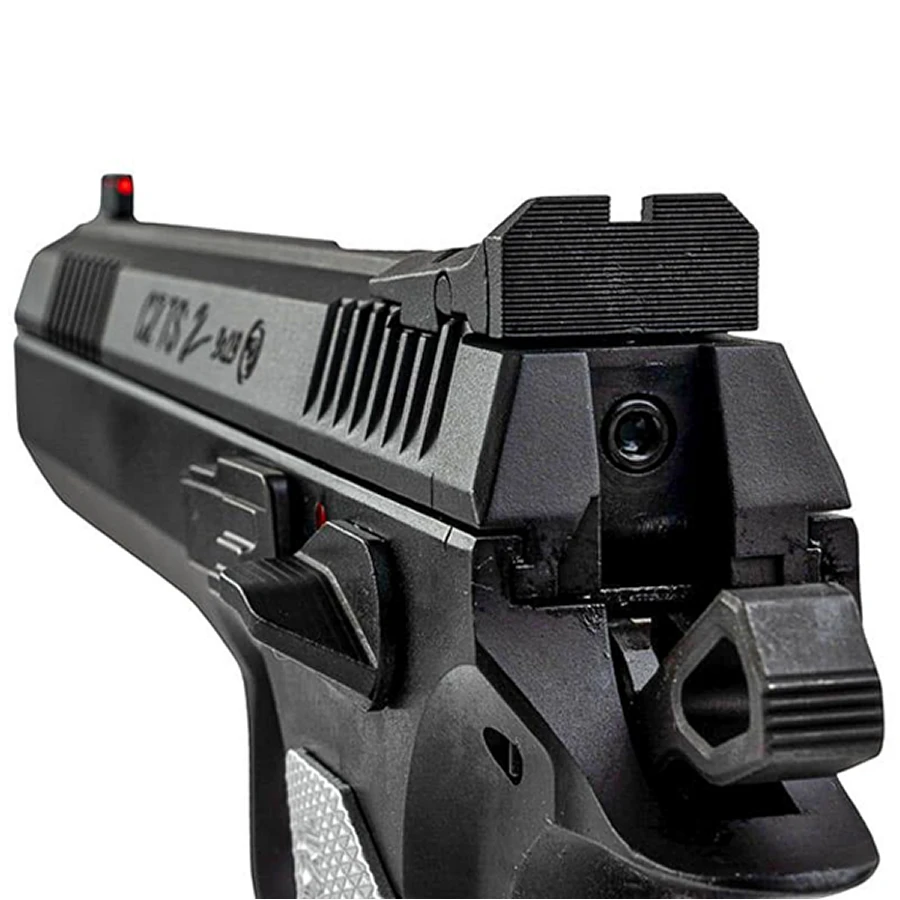 Dari sisi ergonomi, CZ TS2 tampil unggul dengan grip anti-slip menyeluruh, grip duralumin, front sight fiber optic merah yang cepat terbaca, serta rear sight adjustable blacked-out untuk bidikan tajam ala red dot. Ditambah trigger single-action adjustable, extended safety, dan extended mag release—semuanya dirancang untuk kecepatan dan kenyamanan kompetisi.