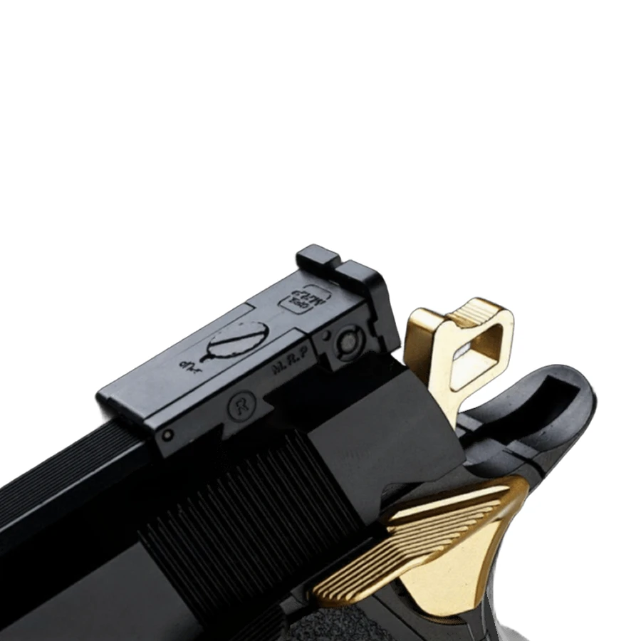 Daya tarik utama Gold Match terletak pada aksen warna emas pada trigger, outer barrel, thumb safety, sekrup, dan hammer. Walaupun bersifat estetis, detail ini memberikan nuansa race gun sejati yang menonjol di arena kompetisi.