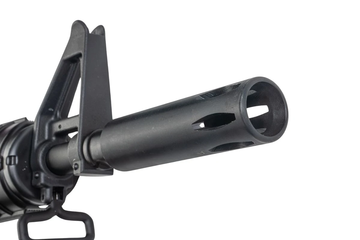 Rifle ini menggunakan moderator khas sepanjang 4.2 inci yang berfungsi mengurangi flash dan menyeimbangkan senjata, memberikan karakter unik yang membedakannya dari varian M16 lainnya.