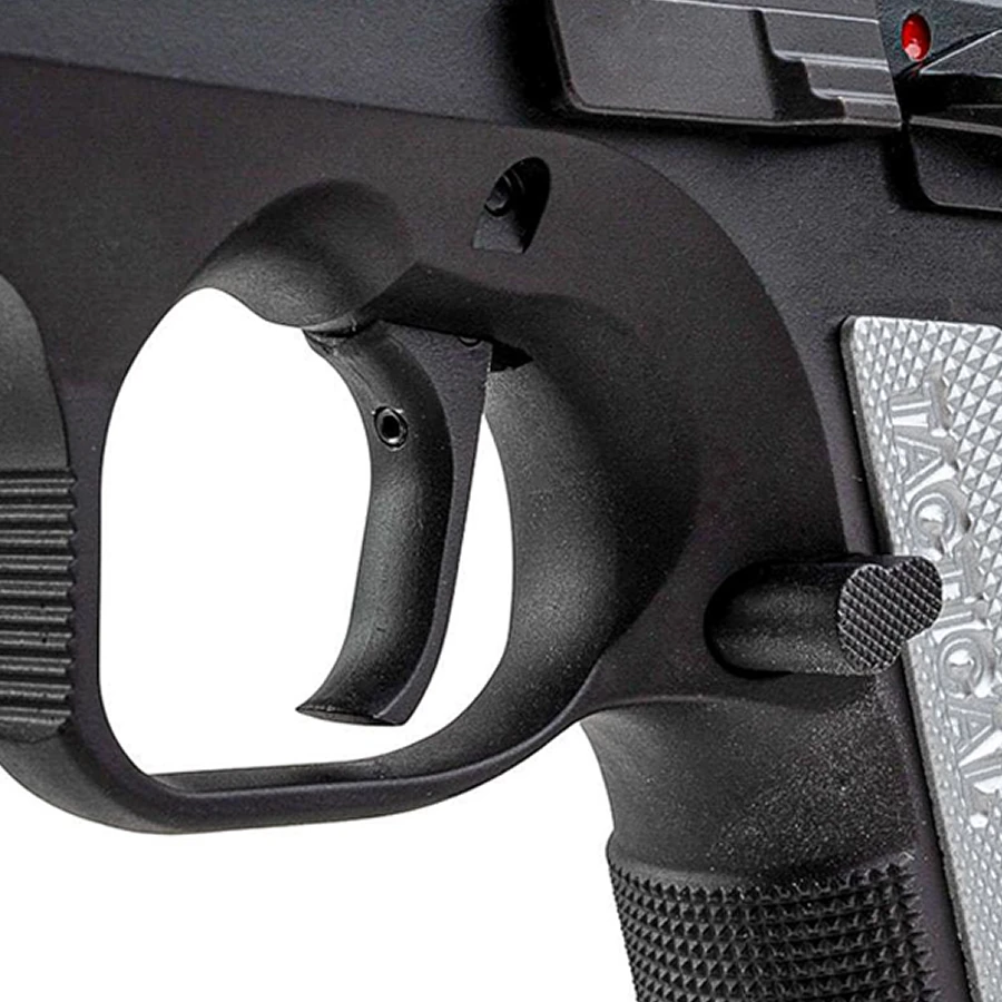 Dari sisi ergonomi, CZ TS2 tampil unggul dengan grip anti-slip menyeluruh, grip duralumin, front sight fiber optic merah yang cepat terbaca, serta rear sight adjustable blacked-out untuk bidikan tajam ala red dot. Ditambah trigger single-action adjustable, extended safety, dan extended mag release—semuanya dirancang untuk kecepatan dan kenyamanan kompetisi.