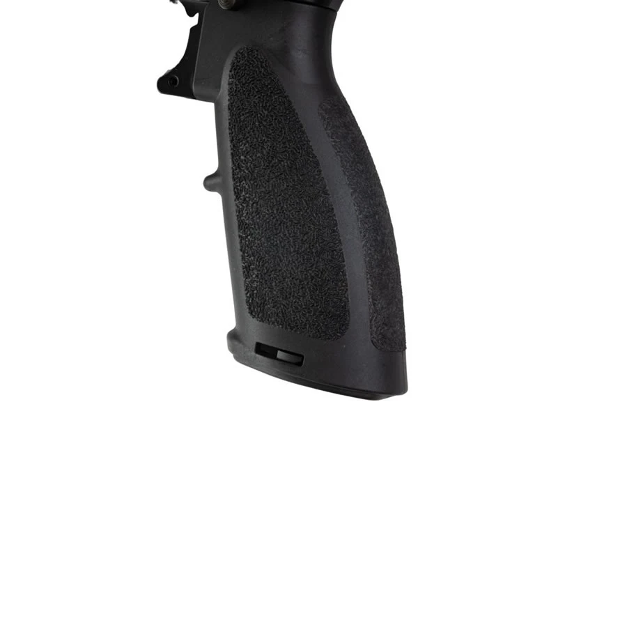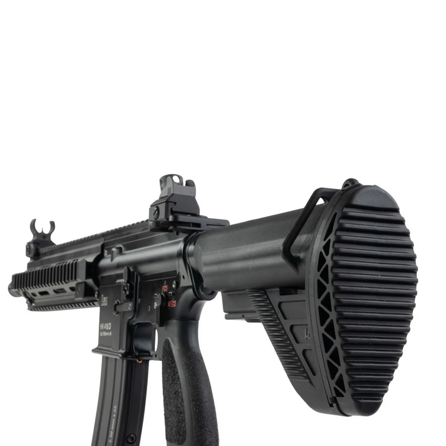 Buffer tube 6 posisi dengan E1 stock ergonomis, dilengkapi sling mount dan ruang penyimpanan baterai atau CO₂